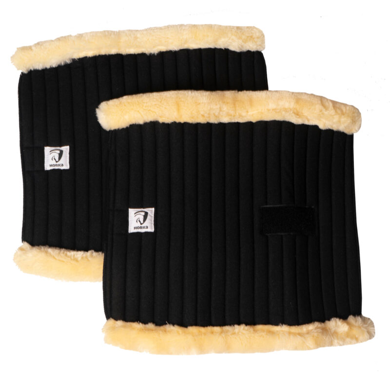 Bløde bandageunderlag fra Horka. Designet med en kant i fauxfur i toppen og i bunden, som beskytter hesten mod slid og gnidninger.