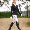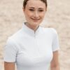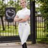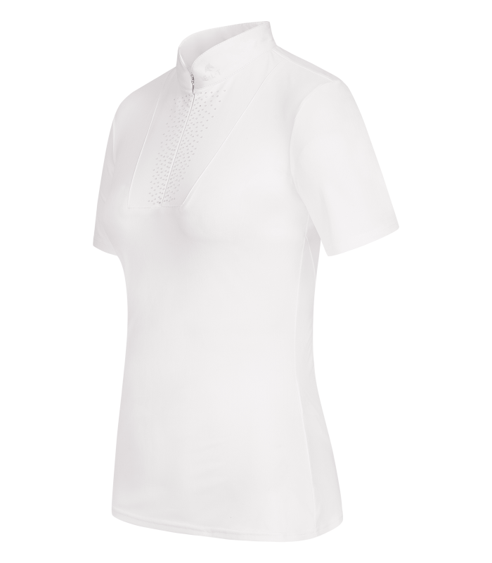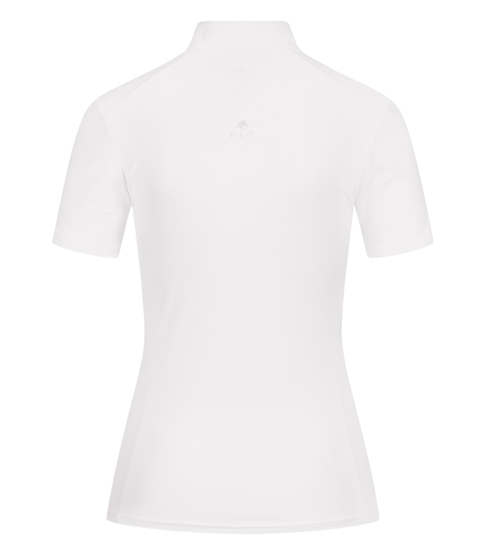 Elegant og funktionel stævneskjorte i et let og teknisk materiale med høj komfort og åndbarhed. Den figursyede pasform sikrer et stilfuldt look, og skjorten er designet med en opretstående krave og en skjult lynlås for et klassisk, rent udtryk. Frontindsatsen er pyntet med fine rhinsten, og både krave og ryg er dekoreret med et diskret, glitrende E·L·T-logo.