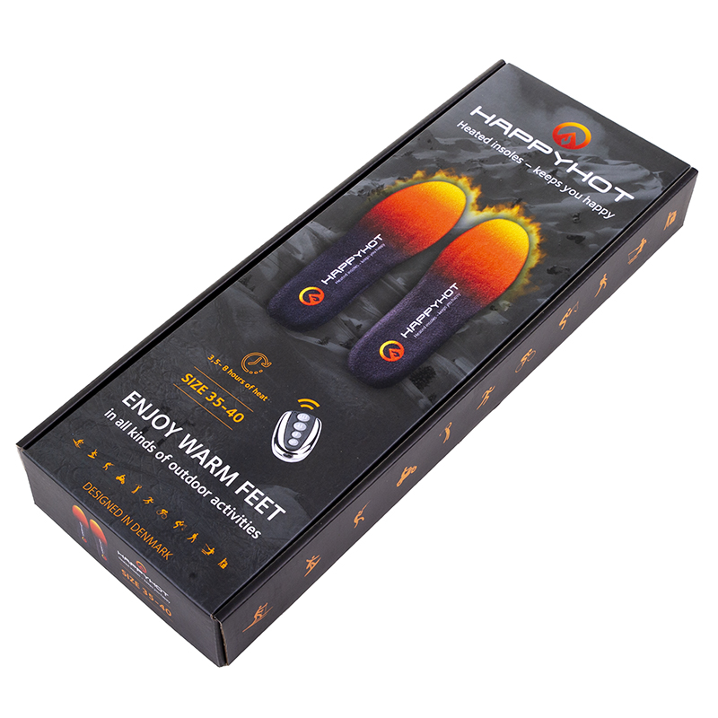 Inden du tager sålerne i brug, skal de oplades. Efter cirka fire timers opladning skifter LED-lyset i sålerne til konstant grønt, hvilket betyder, at de er fuldt opladet. Du kan nemt tænde, slukke og regulere varmen på sålerne via on/off-knappen – enten direkte på sålerne eller med den medfølgende fjernbetjening. Hvis du slukker sålerne med fjernbetjeningen, går de i “standby” (dette vises ved, at lyset blinker). For at slukke helt, skal du holde on/off-knappen på sålerne nede i cirka tre sekunder.