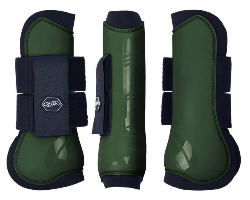 Sæt med to springgamacher til forbenene med hård ydreskal og neoprenfor. Lukkes med velcro. Beskytter hestens ben mod stød og slag.