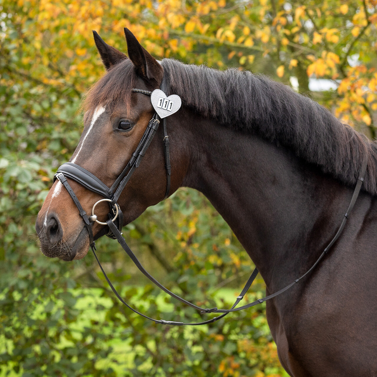 Dette søde hjerteformede stævnenummer er den perfekte detalje til stævnedagen! Den er dekoreret med diskret glimmer og kan nemt fastgøres til underlaget eller trensen ved hjælp af sikkerhedsnåle eller velcrolukning.